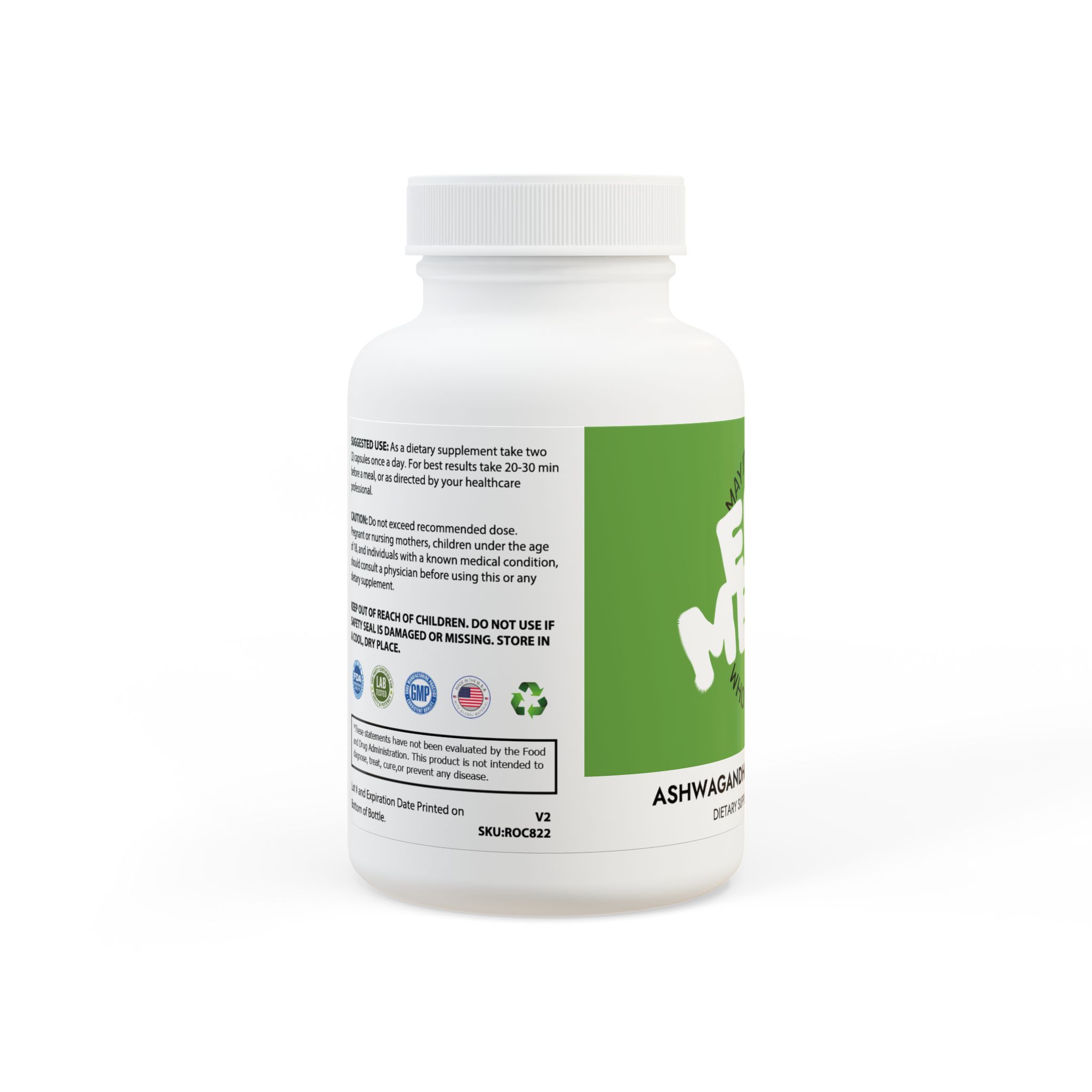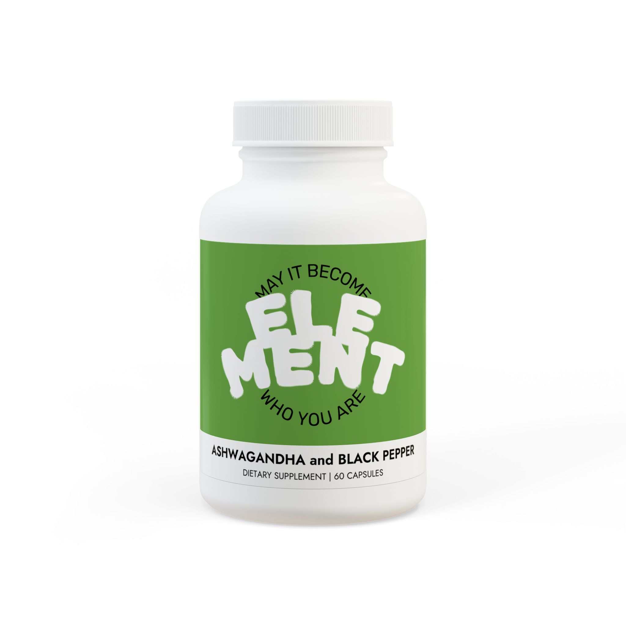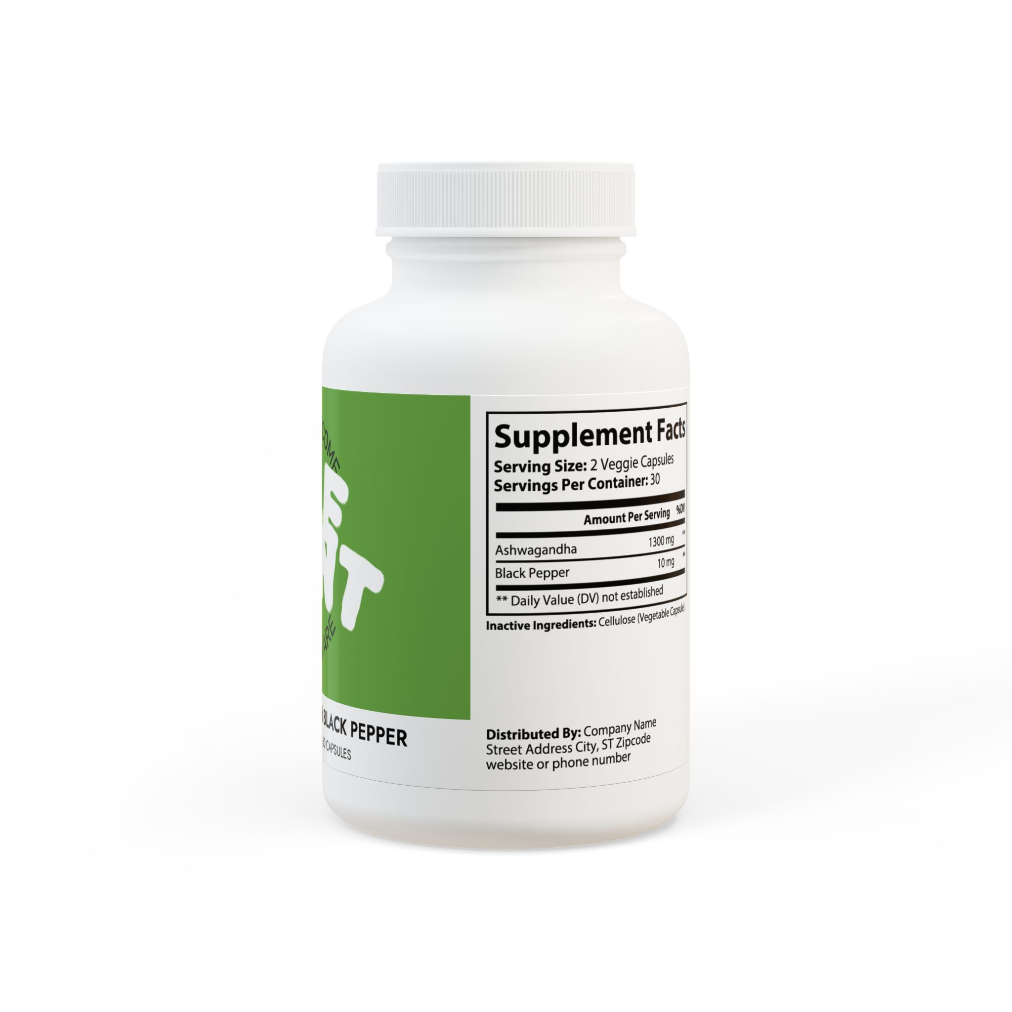 Ingredients: Ashwagandha, Black Pepper. Inactive Ingredients: Cellulose (Vegetable Capsule).