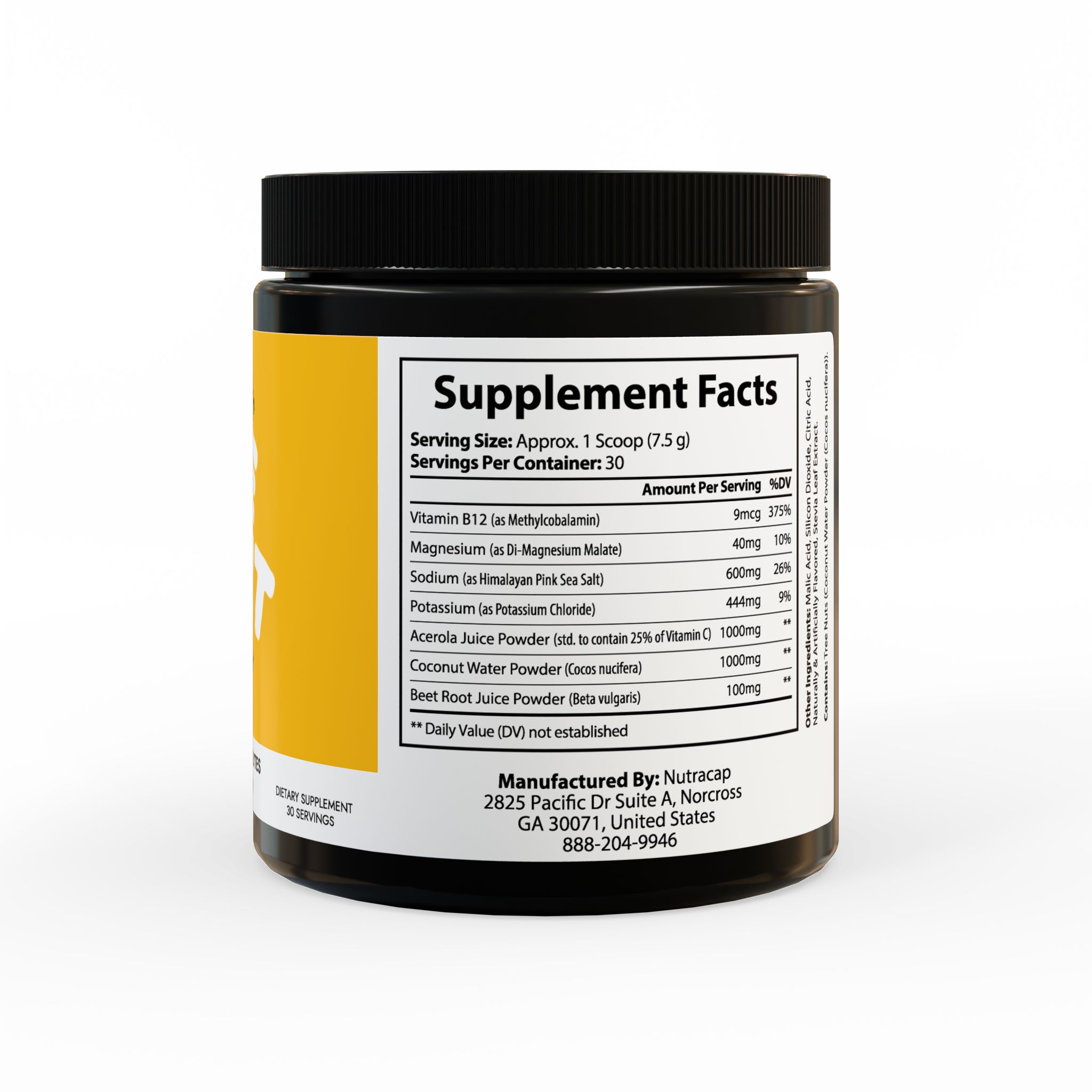Ingredients: Vitamin B12 (as Methylcobalamin), Magnesium (as Di-Magnesium Malate), Sodium (as Himalayan Pink Sea Salt), Potassium (as Potassium Chloride), Acerola Juice Powder (std. to contain 25% of Vitamin C), Coconut Water Powder (Cocos nucifera), Beet Root Juice Powder (Beta vulgaris). Other Ingredients: Malic Acid, Silicon Dioxide, Citric Acid, Naturally & Artificially Flavored, Stevia Leaf Extract. Contains: Tree Nuts (Coconut Water Powder (Cocos nucifera)