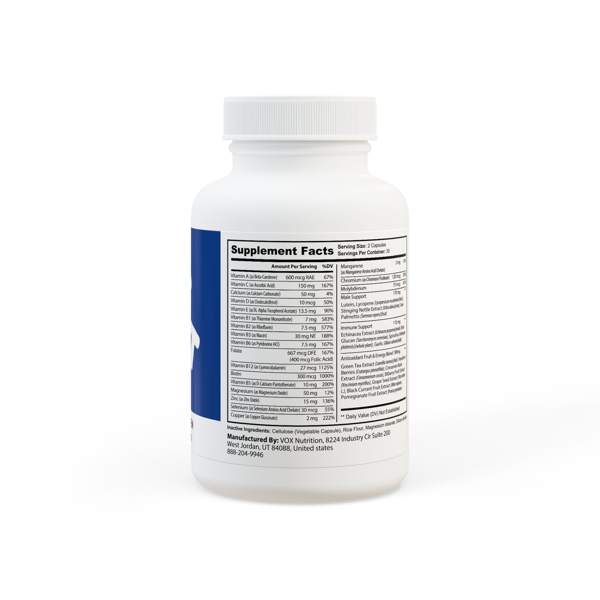 Ingredients: Vitamin A (as Beta-Carotene), Vitamin C (as Ascorbic Acid), Calcium (as Calcium Carbonate), Vitamin D (as Cholecalciferol), Vitamin E (as DL-Alpha Tocopherol Acetate), Vitamin B1 (as Thiamine Mononitrate), Vitamin B2 (as Riboavin), Vitamin B3 (as Niacin), Vitamin B6 (as Pyridoxine HCI), Folate, (400 mcg Folic Acid), Vitamin B12 (as Cyanocobalamin), Biotin, Vitamin B5 (as D-Calcium Pantothenate), Magnesium (as Magnesium Oxide), Zinc (as Zinc Oxide), Selenium (as Selenium Amino Acid Chelate), Copper (as Copper Gluconate), Manganese (as Manganese Amino Acid Chelate), Chromium (as Chromium Picolinate), Molybdenum, Lutein, Lycopene (Lycopersicum esculentum)(fruit), Stinging Nettle Extract (Urtica dioica)(root), Saw Palmetto (Serenoa repens)(fruit), Green Tea Extract (Camellia sinensis)(leaf), Hawthorn Berries (Crataegus pinnatida), Cinnamon Bark Extract (Cinnamomum cassia), Bilberry Fruit Extract(Vaccinium myrtillus), Grape Seed Extract (Vitis vinifera L.), Black Currant Fruit Extract (Ribes nigrum), Pomegranate Fruit Extract (Punica granatum), Echinacea Extract (Echinacea purpurea)(aerial), Beta Glucan (Saccharomyces cerevisiae), Spirulina (Arthrospira platensis)(whole plant), Garlic (Allium sativum)(bulb). Inactive Ingredients: Cellulose (Vegetable Capsule), Rice Flour, Magnesium stearate, Silicon dioxide.