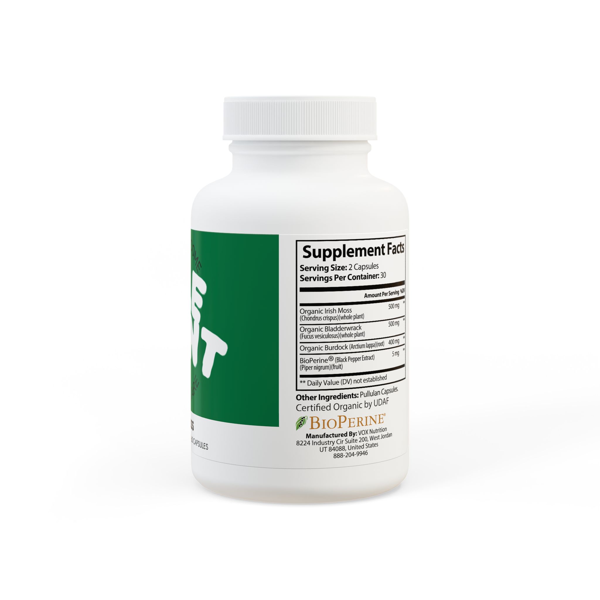 Ingredients: Organic Irish Moss (Chondrus crispus)(whole plant), Organic Burdock (Arctium lappa)(root), Organic Bladderwrack (Fucus vesiculosus)(whole plant), BioPerine® (Black Pepper Extract), (Piper nigrum)(fruit). Other Ingredients: Pullulan Capsules.